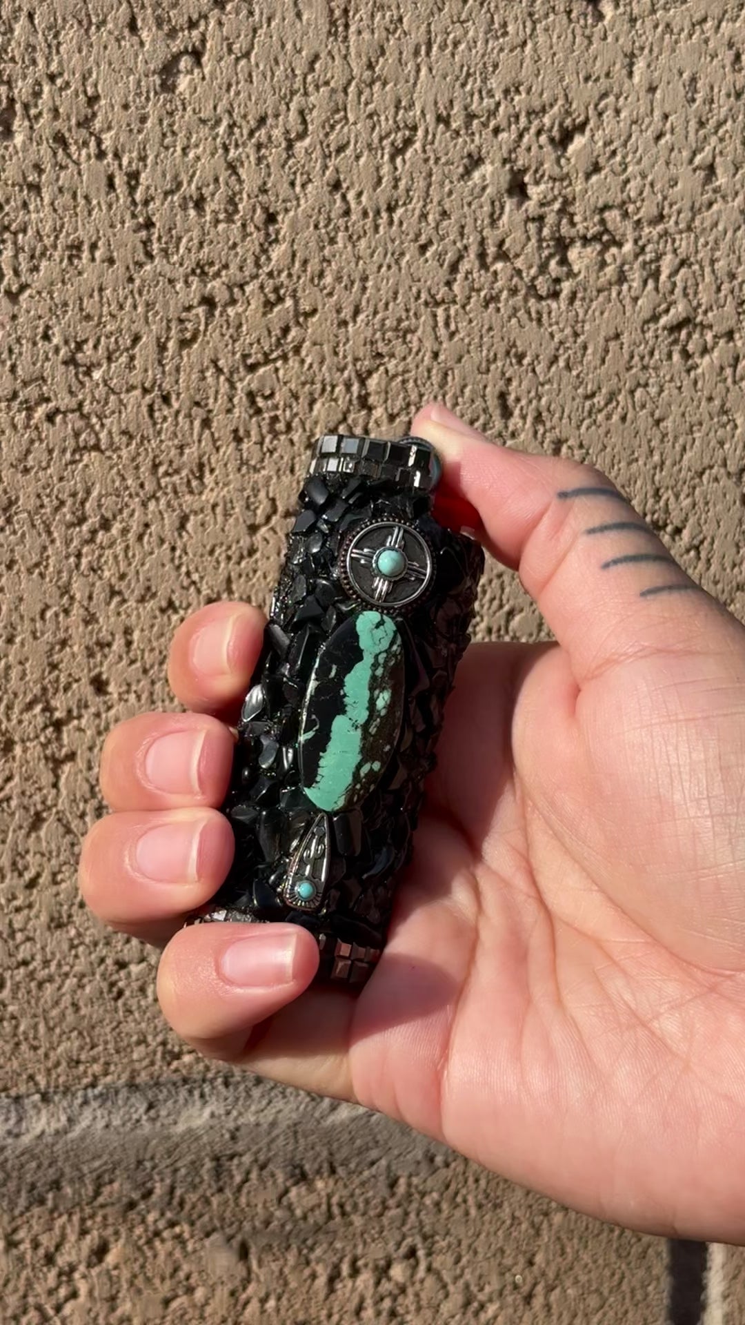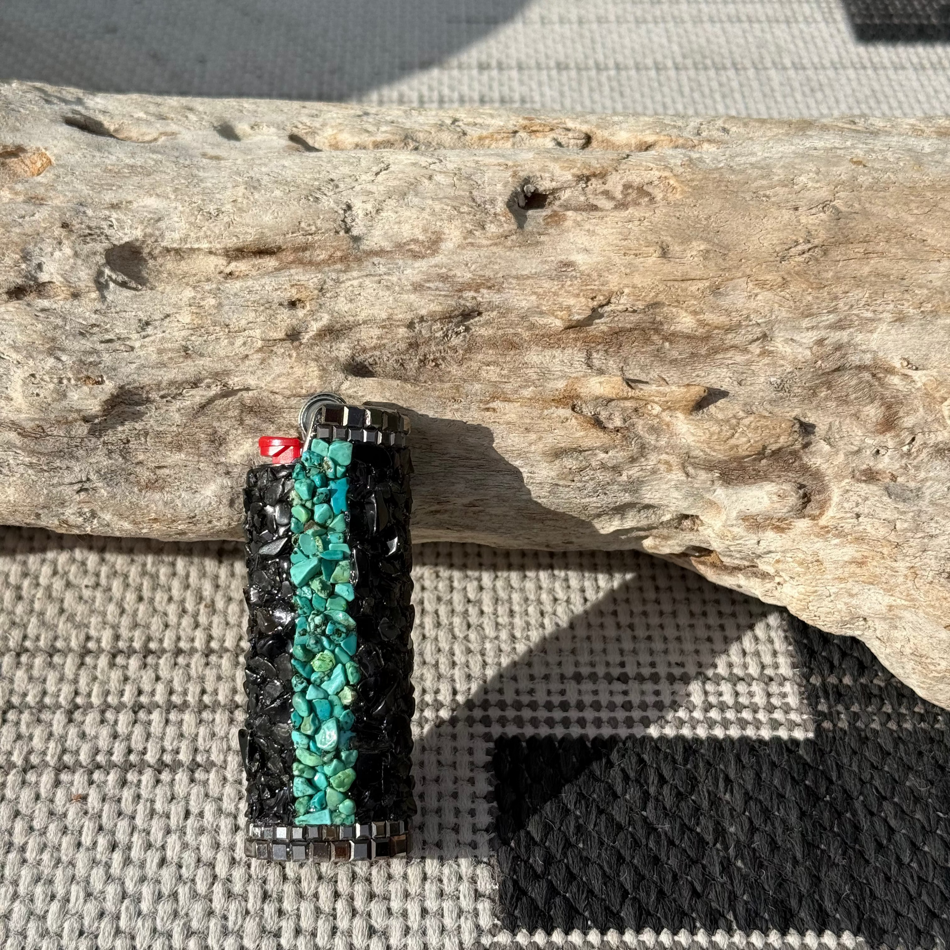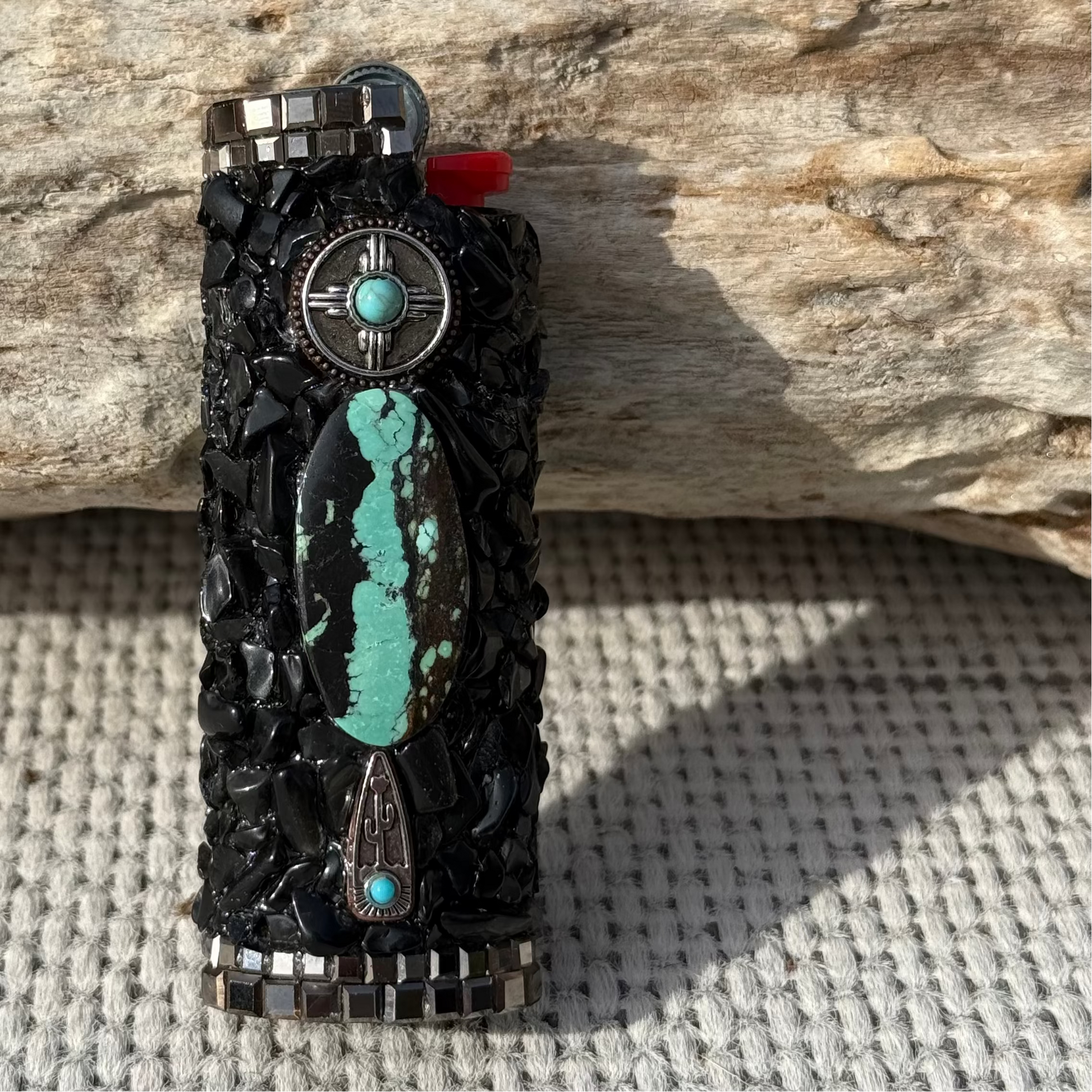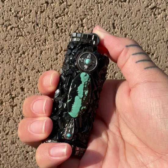Metal SC sleeve made with: Hubei Turquoise - Onyx - Smoke Glass Squares - Bronze and Turquoise Metal Charms.